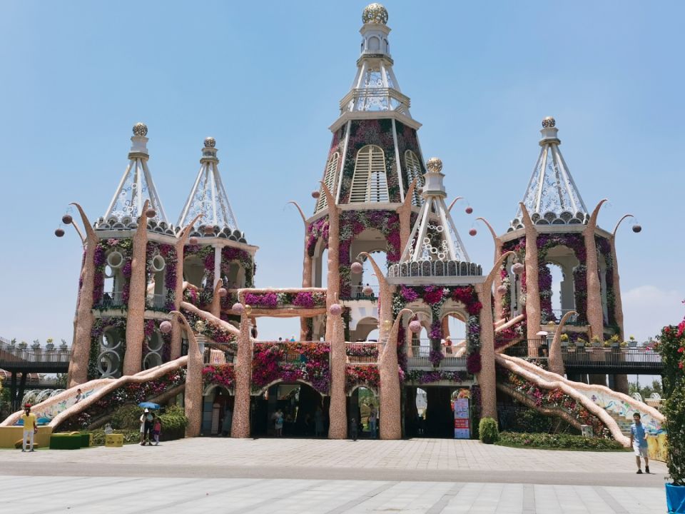 2019年的暑假里,爸爸妈妈带我去闵行区的浦江郊野公园,这是一次非常富有意义的一日游,所以拍了些照片来记录它。在众多照片中,我最喜欢的是这张。它位于浦江郊野公园的奇迹花园区,是由大约200万株奇花异卉组成的一座花的乐园。这晴空万里的天空和这梦幻无穷的城堡,都宛如在童话世界里一样。连城堡的廊柱边上都种满了五彩绚丽的鲜花。第一次看到她们,就深深的爱上了。本张照片我选用了整张画面来突出城堡的全貌,尽量把最好看的一面展示出来。