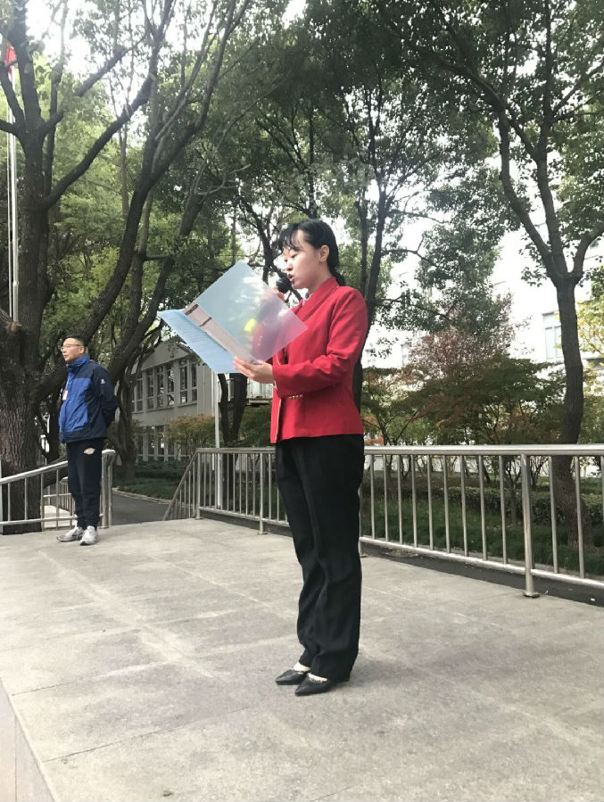 尊敬的各位老师,亲爱的同学们,大家早上好。我是17级邮轮一班的管玥莹,很荣幸今天的升旗仪式由我来主持。