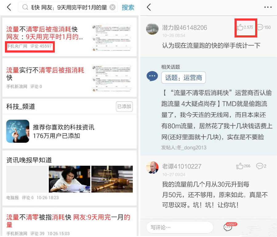 据央广网财经记者统计,《流量不清零后被指消耗快 网友:9天用完平时1月的量》稿件在今日头条新闻客户端发布的三天(26日—28日)内,共留下网友的45597条评论,其中一条“认为现在流量跑的快的举手统计一下”的跟帖,共有2.5万网友点赞认同。
